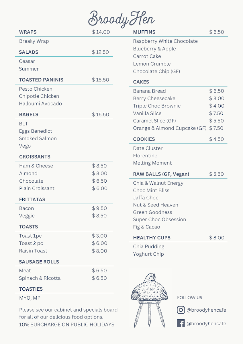 Welcome to Broody Hen Coffee Shop, a delightful café nestled in the heart of Fremantle. With its cozy ambiance and welcoming staff, it’s the perfect spot to unwind over a cup of exceptional coffee. The menu features a range of tempting offerings, including the hearty Breaky Wrap at A$14.00 and fresh salads like the Caesar for A$12.50 and the refreshing Summer for A$15.50.